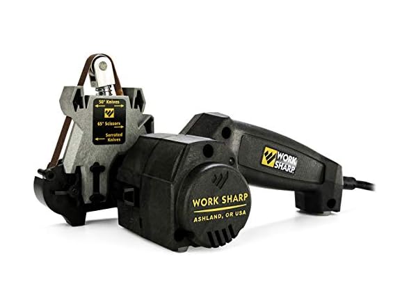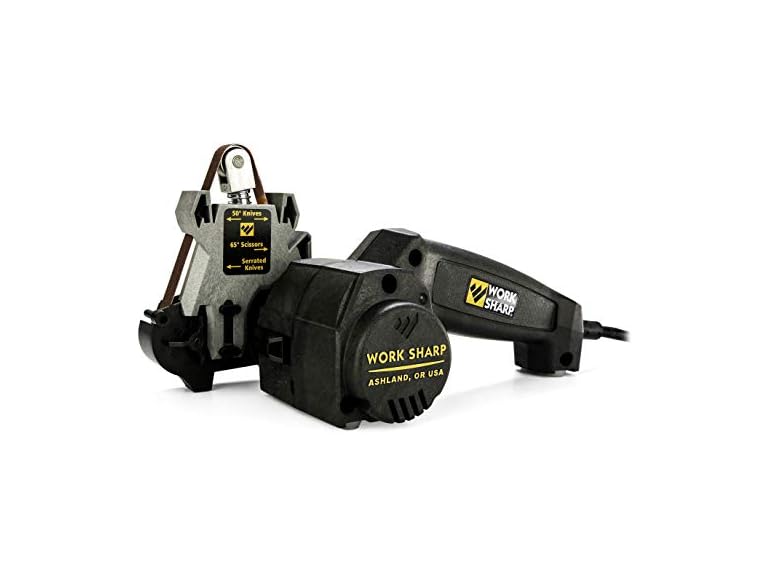 The Original Knife & Tool Sharpener is the first knife sharpener designed to sharpen every knife you own. Using flexible abrasive belts, the sharpener is able to sharpen not just straight bladed knives, but also curved knives, tanto blades, filet knives, serrated knives, gut hooks and virtually any other shape of knife blade. The Knife & Tool Sharpener uses precision angle sharpening guides to ensure that you get the proper angle every time. Two guides are included: a 50° guide for hunting and outdoor knives (25° per bevel) and a 40° guide for thinner blades and kitchen knives (20° per bevel). Professional knife makers use flexible belts to put a razor sharp edge on their blades, and now you can have the same technology at home to use any time your knives get dull. You may already have other sharpening methods, but never before has a knife sharpener been able to quickly and easily sharpen this broad range of knives to such extremely sharp results. Sharpening scissors requires the use of the scissor guide. Freehand sharpening cannot create the consistent edge necessary for scissors to cut. The scissor guide is set at 65° based on the most common scissor edge angles. The guide is designed for common "household" size scissors, including kitchen and shop shears. A 60° angled scissor guide is available on the optional 40° Outdoor Knife Guide. It is possible to regrind damaged scissor blades to 65° or 60° angle regardless of the original angle of the edge