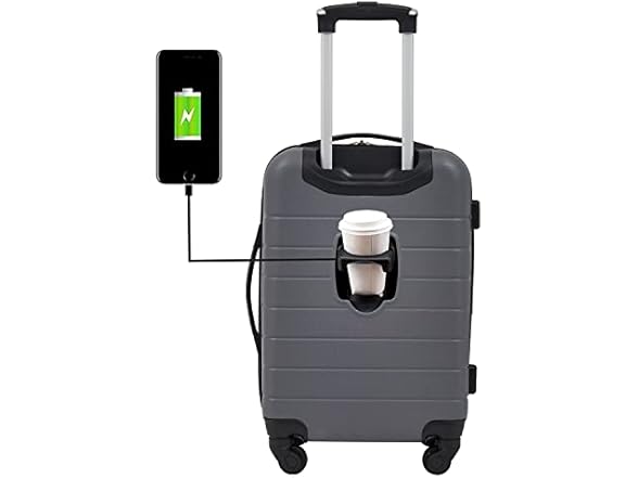 - Patented 3-in-1 cup holder, USB port, and phone holder located in back of each luggage unit for travel convenience