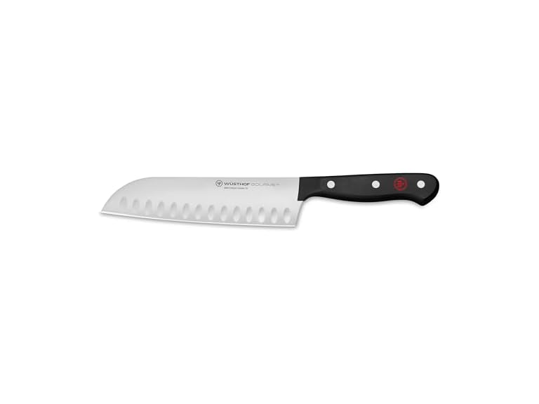 - WÜSTHOF SANTOKU KNIFE – The GOURMET 7" Hollow Edge Santoku Knife is designed with a thinner blade than the traditional chef’s knife, at a 10 cutting edge, and gradually curves up at the very end providing a straighter edge. The hollow edge is crafted with evenly spaced vertical indentations, which create small air pockets between the blade and the food that gently pushes food off the blade