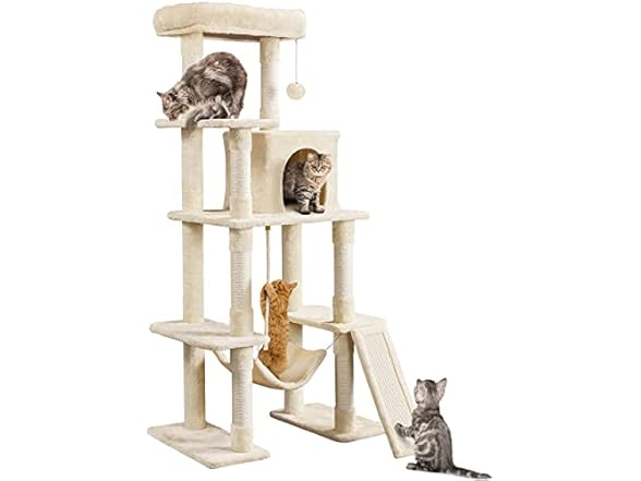 - GOOD FUNCTIONALITY: The large cat tower has multiple levels for cats to play and sleep, including a top perch with a danging ball, a condo, a hammock, a hanging rope, a scratching board, seven scratching posts, and some extended platform space
