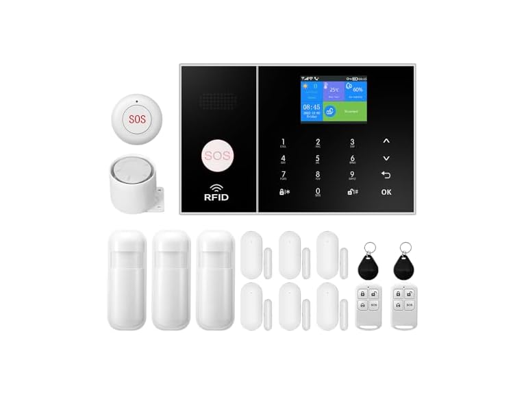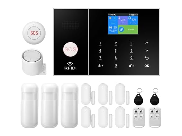 - [ No Monthly Fee ]: No hidden costs and subscription fee. Work with Free app ("Tuya" and "Smart Life" app). You can control your alarm system anytime anywhere with your smartphone. Works with Alexa and Google Assistant, you can use voice to control your alarm system. Package includes 1* alarm host, 3* PIR motion detector, 6* door window sensors, 2* remote controls, 2* RFID card, 1* alarm siren and 1* SOS button, all come with the required batteries.