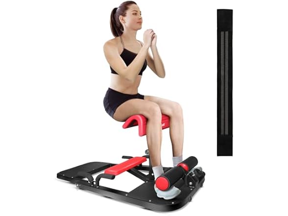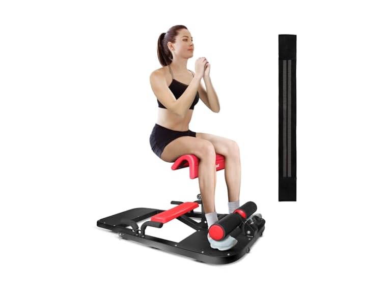 - MULTIFUNCTION & EFFECTIVE WORKOUTS: Sissy squat machine home offers 5 adjustable height levels, easy to find comfortable position; Comes with two 60 lbs resistance bands and padded covers to enhance workout intensity; Unlock various exercises such as Bulgarian split squats, back extensions, hip thrusts, and sissy squats
