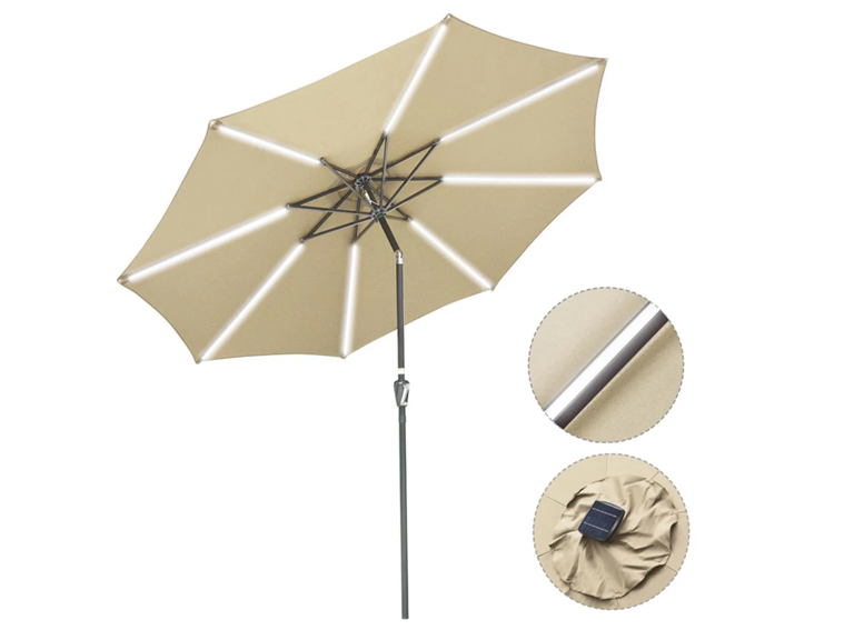 - This 9ft 8 ribs patio umbrella is designed with solar-powered LED lights, adding shade at day and offering light at night, decorating your patio, garden, backyard with this umbrella, you can enjoy your outdoor life at daytime and night