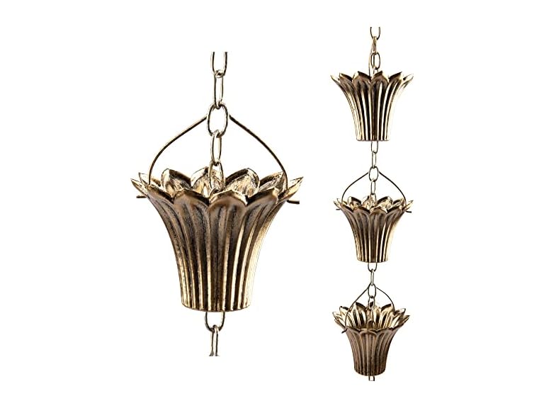 - (1) YJNSFT 8 ft Copper Plated Rain Chain for Outside Downspouts, Adjustable Rain Catcher for Garden Gutters, Decorative Metal Hanging Flower Spiral Rain Bells, 12 Lilys Cups, Brass Color