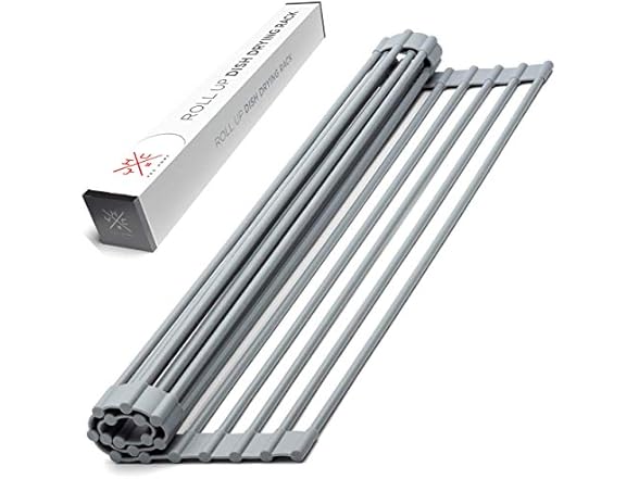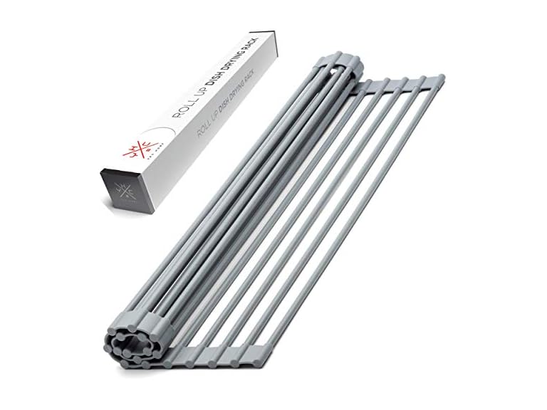 - SAVE SPACE & DECLUTTER - Save valuable kitchen counter space with this collapsible over the sink dish drying rack. After your dishes have dried, roll up the dish dryer rack and store away to declutter your kitchen. Dimensions: 20.5 inches x 13 inches.