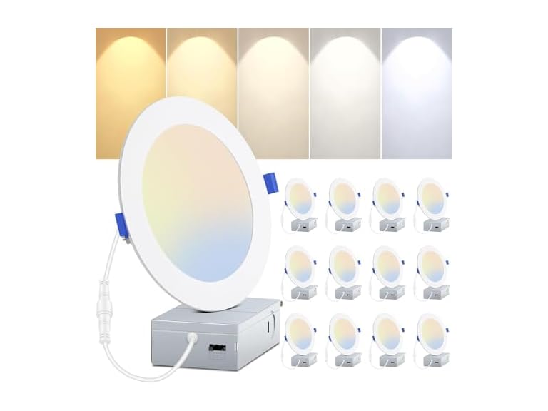 In the Box: (1) Yochoice 12 Pack 6 Inch 5CCT Ultra-Thin LED Ceiling Recessed Lights with Junction Box, Dimmable Can Lighting, 2700K/3000K/3500K/4000K/5000K Selectable, 12W 120W Eqv, 1200LM Brightnes Canless Wafer Downlight