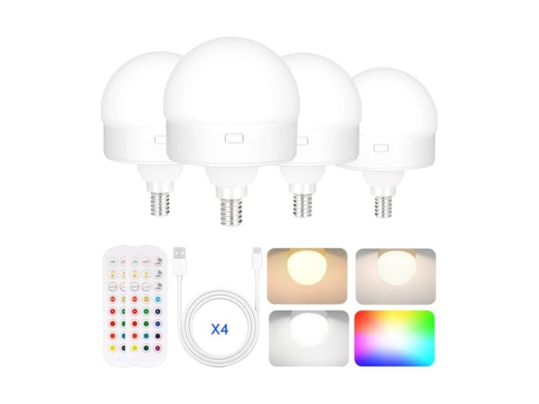 In the Box: (1) Yochoice 4-Pack E12 Rechargeable Battery Operated Light Bulb with Remote, Dimmable LED Bulb with 15 Colors Selectable & 3 Timer, Wireless Detachable Puck Light Bulb for Wall Sconce, Non-Hardwired