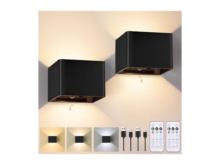 - (1) Yochoice Motion Sensor Wall Sconces with Remote Control, 6000mAh Black Wireless Touch Control Rechargeable Lamps with 3 Color Temperatures, LED Up Down Battery Operated Wall Lights Indoor, 2-Pack