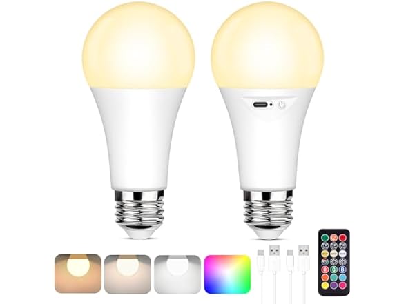 In the Box: (1) Yochoice Rechargeable Battery Operated Light Bulb with Remote Control, Dimmable LED A19 Bulb with 9 Colors Selectable & 3 Timer, Wireless Light Bulb for Wall Sconce, Non-Hardwired,2 Pack