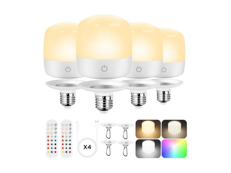 In the Box: (1) YoChoice Rechargeable Battery Operated Light Bulb, Dimmable LED Bulb with Remote & Detachable Base, 4000mAh E26 Battery Powered Light Bulb for Non-Hardwired Lamps with 15 Colors Selectable & 3 Timer, 4Pack