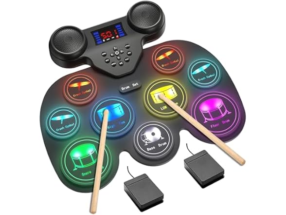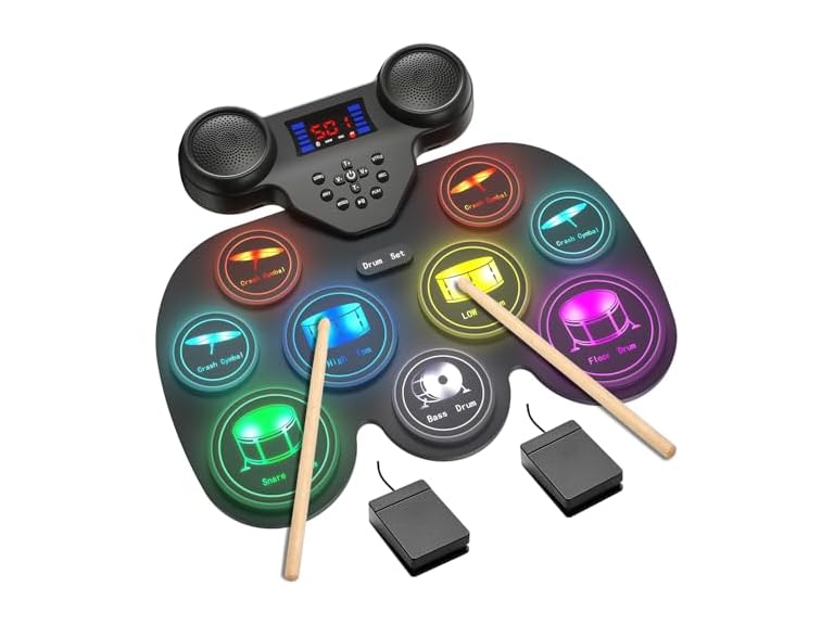 - Yottix Electric Drum Set with 7 Colorful LED Light Patterns, Enhanced Rebound Feel Electronic Drum Kit Featuring 9 Pads, Bluetooth MIDI, and Dual Speakers