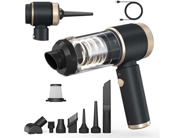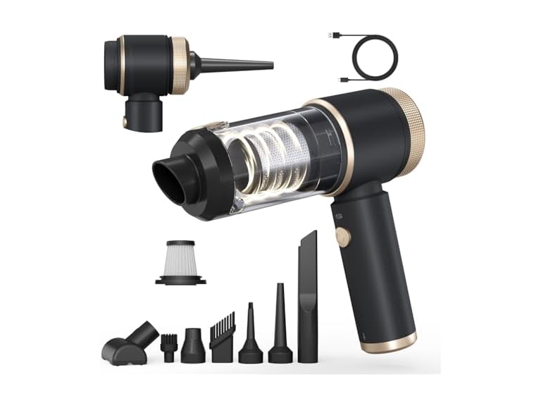 - 【7-IN-1 Multi functional Car Vacuum Cleaner】The handheld vacuum cleaner Includes 7 exclusive accessories and can clean at multiple angles. It combines blowing, suction, inflation and compression modes into one. It is not only a vacuum cleaner, but also a blower. The round-headed brush can blow away dust from keyboards and narrow gaps, the nozzle can inflate balloons or compress bags, and the floor brush and nozzle brush can suck away all hair and various particle debris, which can meet your cleaning needs in any scenario.