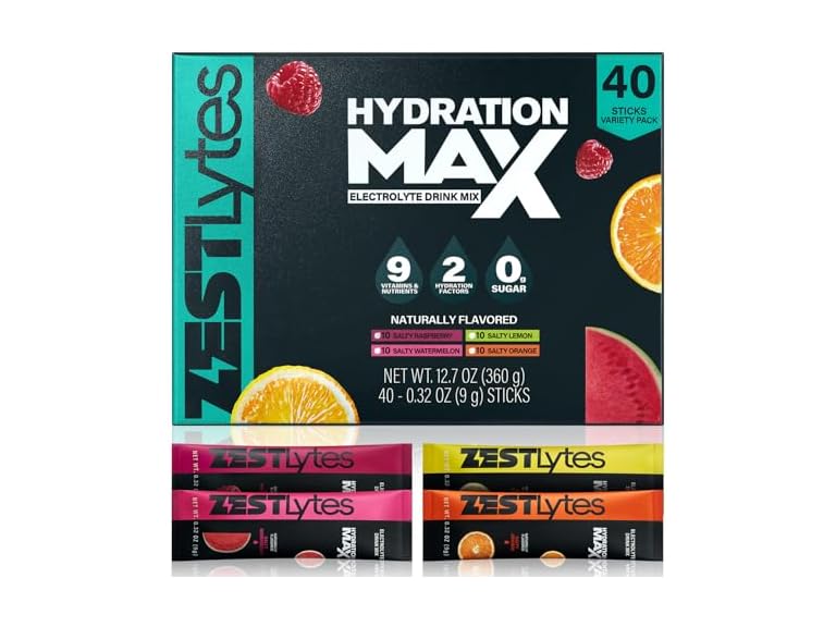 - SALTY FRUIT FLAVOR BUILT FOR INTENSITY:ZestLytes Hydration Max packs 590mg Sodium, 330mg Potassium, 27mg Magnesium, and 5 performance vitamins to fight dehydration fast and keep muscles firing during 1–2 hour high-intensity sessions—from marathons and team sports, to HIIT, cycling, hiking, and heat-heavy outdoor work