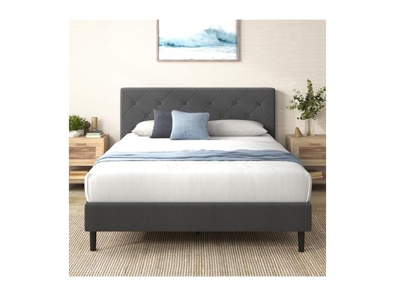 - (1) Zinus King Shalini Upholstered Platform Bed Frame with Headboard [New WonderBox(TM) Version], Wooden Slat Support, No Box Spring Needed, Easy Assembly, Eco Friendly Packaging, Dark Grey