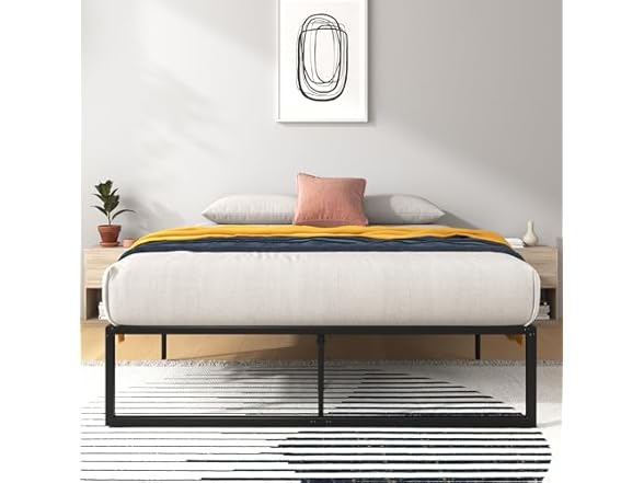 - (1) Zinus Lorelei 14 Inch Metal Platform Bed Frame, Steel Slat Support, No Box Spring Needed, Eco Friendly WonderBox(TM) Packaging, 12.4” Underbed Storage, Easy Assembly, Black, King