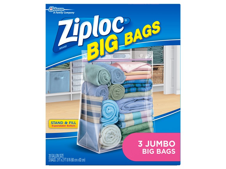 Organize, protect and transport—anything, anywhere. Get more out of the space in your home with Ziploc brand Big Bags.They’re the biggest, most versatile Ziploc brand Bags ever created. Use them to store clothing, bedding, holiday decorations, sports equipment and more. No more clutter in the garage, the basement or the closet.