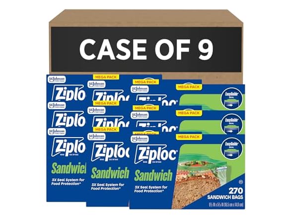 - (1) Ziploc Sandwich and Snack Bags, Easy Open and Close, Plastic Food Storage Bags, 270 Bags Total (Packaging May Vary), Pack of 9