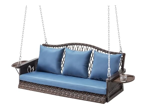 - 【Ergonomic & Comfy Design】: Our porch swing curves in the knee area to provide you the best sitting experience. Two cup holders, spacious seat with high density thicken cushion, plus high quality fabric that is anti-stain, anti-fade and anti-wear